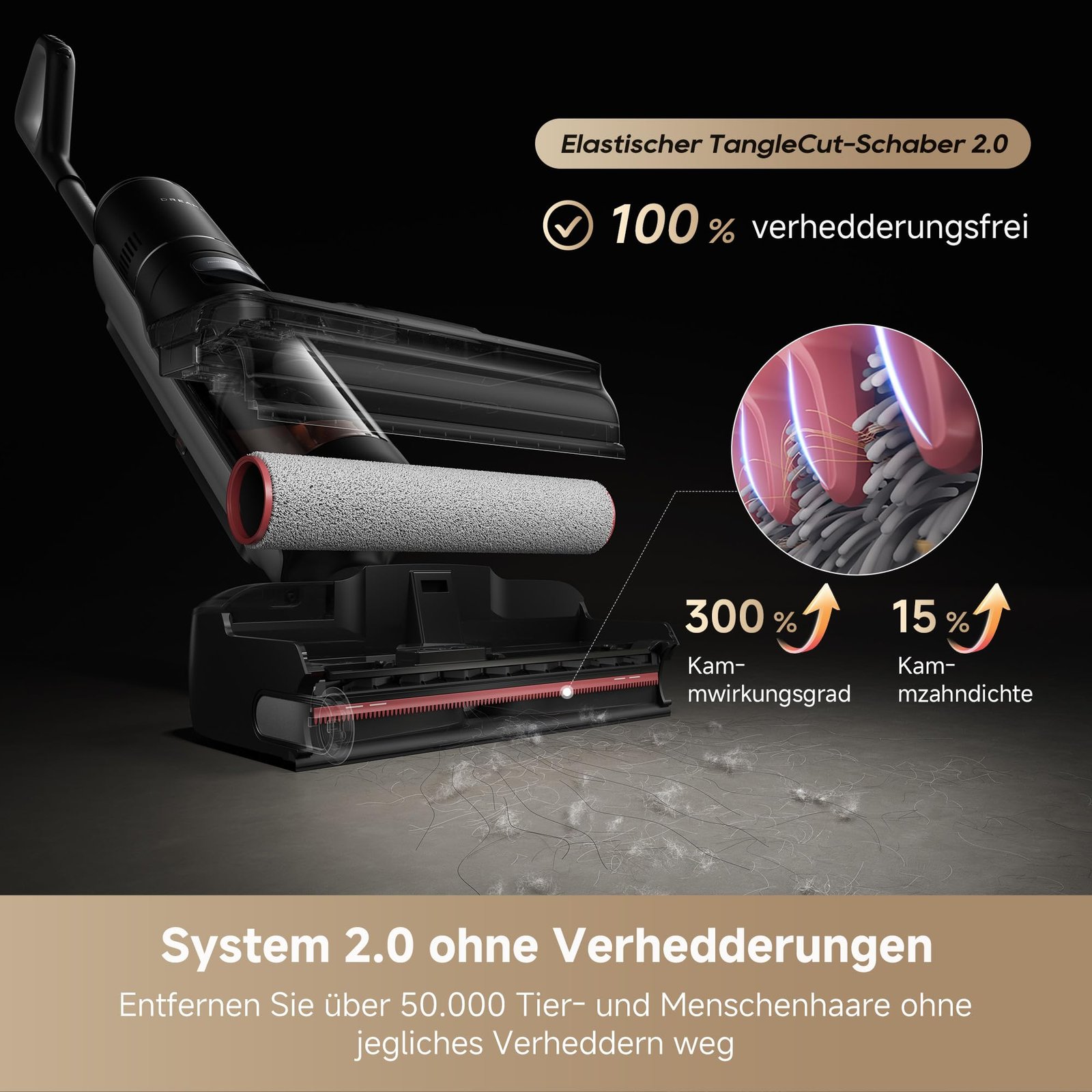 Dank des 180°-Flachdesigns gleitet der Sauger mühelos unter niedrige Möbel und erreicht selbst versteckten Schmutz – bei konstanten 23.000 Pa, auch in vollständig flacher Position.