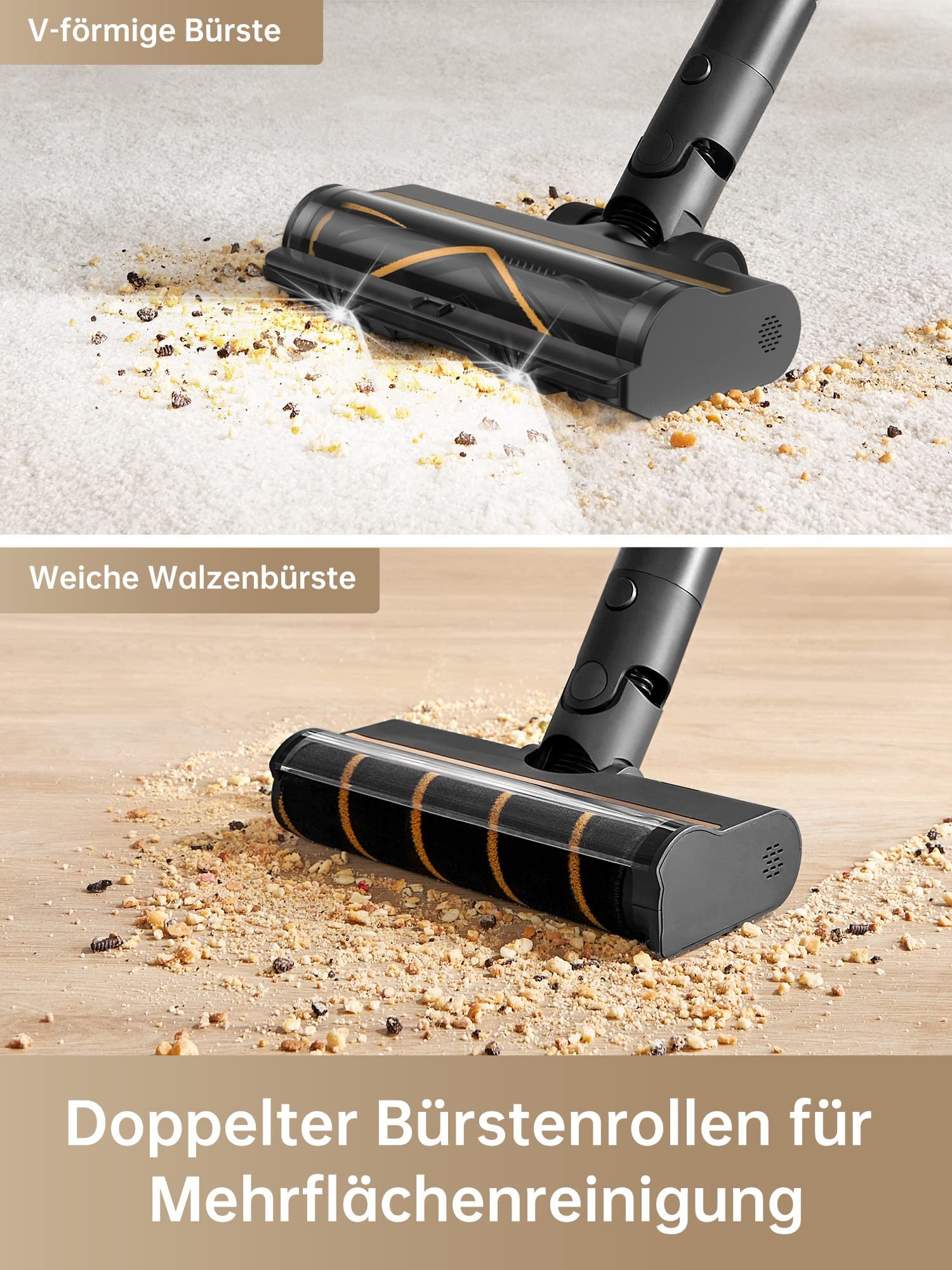 Die austauschbaren Bürstenköpfe ermöglichen maximale Anpassungsfähigkeit. Der Mehrflächen-Bürstenkopf eignet sich für unterschiedliche Bodenarten, während der Softrollen-Bürstenkopf empfindliche Hartböden besonders schonend reinigt. Der einfache Wechsel der Bürsten erleichtert die gründliche Reinigung von Kanten und Übergängen.